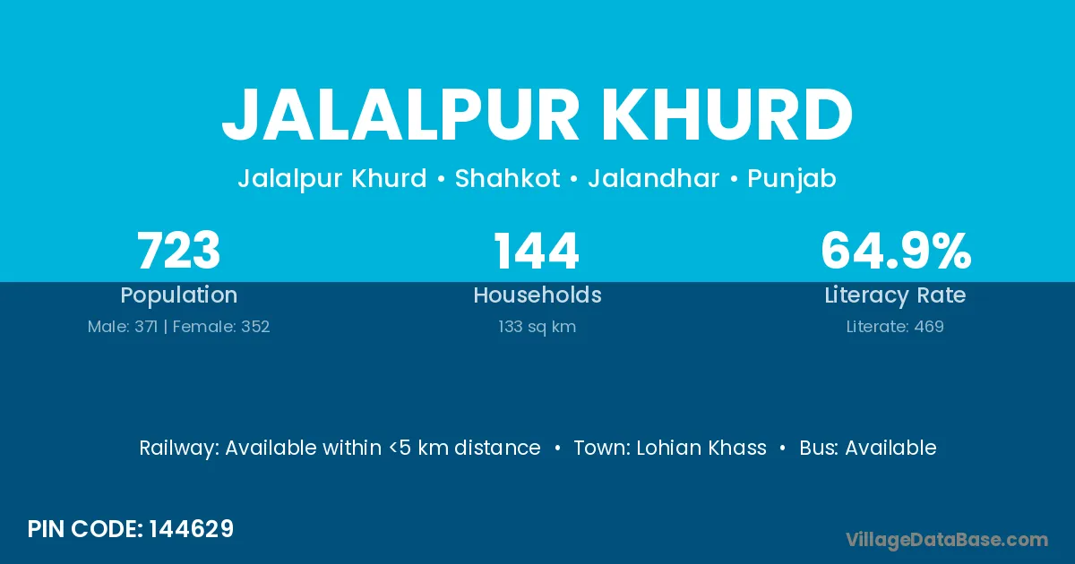 The literacy rate of Jalalpur Khurd village is 68.59%. Male literacy stands at 76.94% and female literacy at 59.05%.