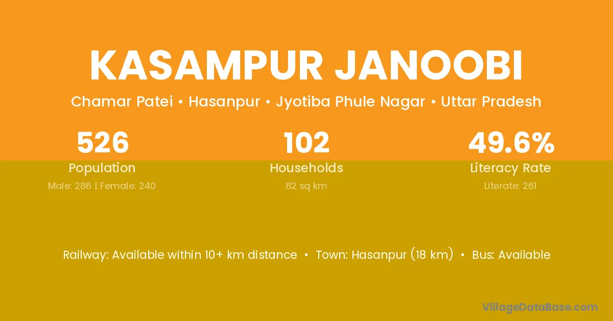 Hasanpur (18 km) is the nearest town to Kasampur Janoobi village for major economic activities and is located approximately 18 km away.