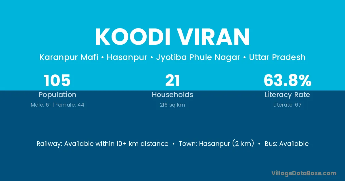 Hasanpur (2 km) is the nearest town to Koodi Viran village for major economic activities and is located approximately 2 km away.