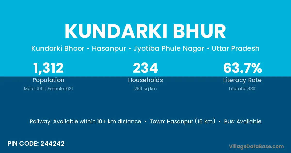 Hasanpur (16 km) is the nearest town to Kundarki Bhur village for major economic activities and is located approximately 16 km away.