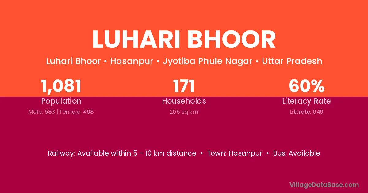 Luhari Bhoor village has a total population of 1,081 people, of which 583 are males and 498 are females.