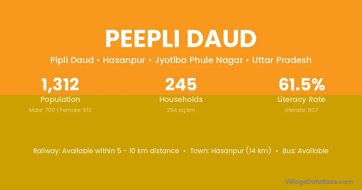 Hasanpur (14 km) is the nearest town to Peepli Daud village for major economic activities and is located approximately 14 km away.