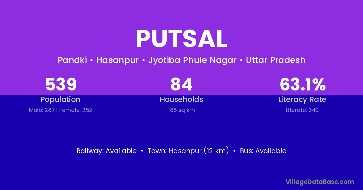Hasanpur (12 km) is the nearest town to Putsal village for major economic activities and is located approximately 12 km away.