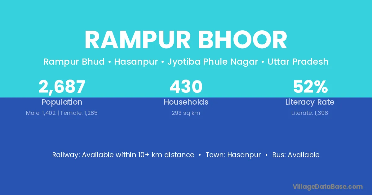 Rampur Bhoor village has a total population of 2,687 people, of which 1,402 are males and 1,285 are females.