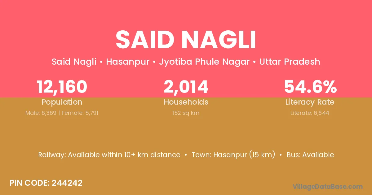 Hasanpur (15 km) is the nearest town to Said Nagli village for major economic activities and is located approximately 15 km away.