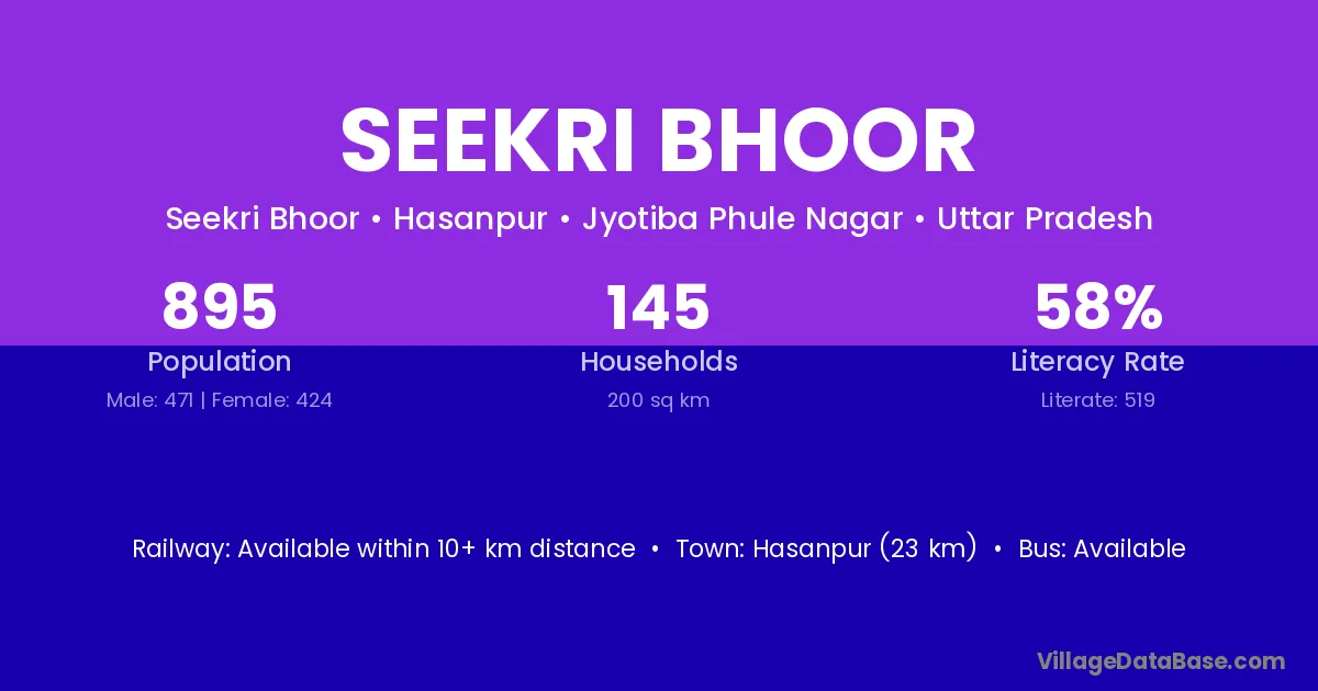 Hasanpur (23 km) is the nearest town to Seekri Bhoor village for major economic activities and is located approximately 23 km away.