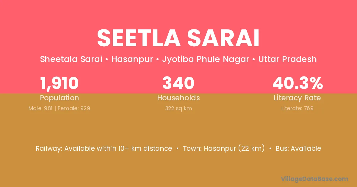 Seetla Sarai village has a total population of 1,910 people, of which 981 are males and 929 are females.
