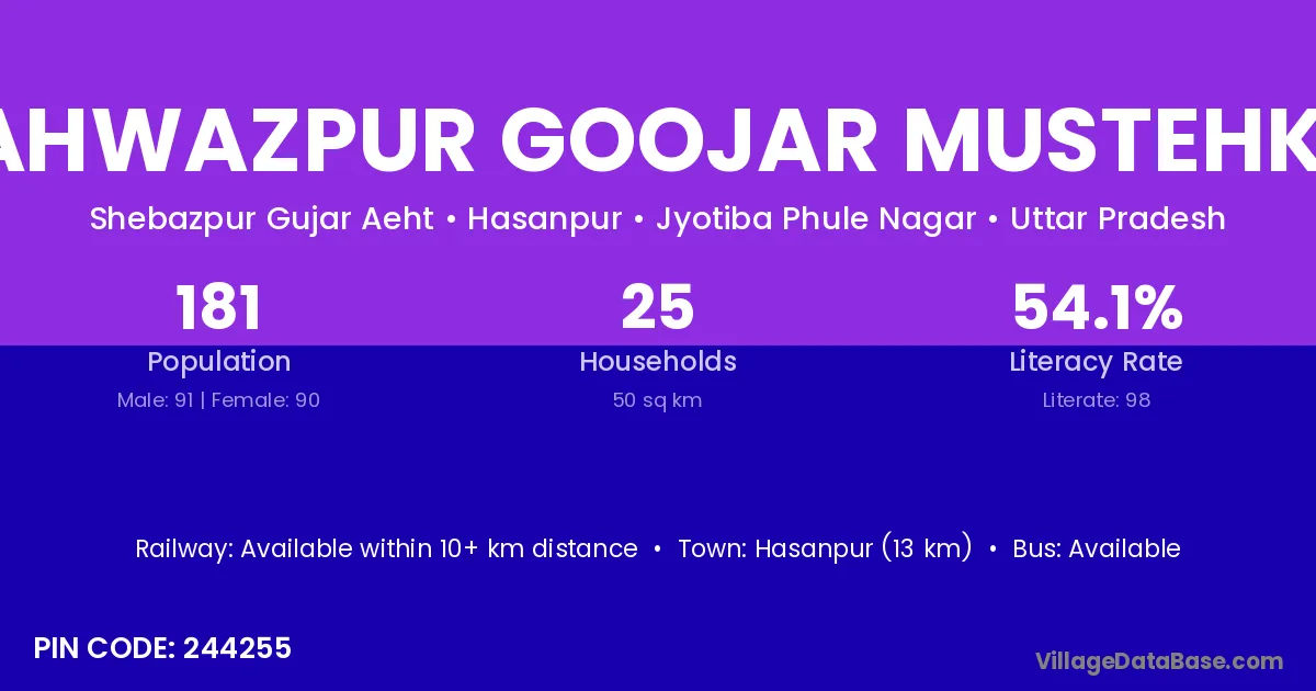 Hasanpur (13 km) is the nearest town to Shahwazpur Goojar Mustehkam village for major economic activities and is located approximately 13 km away.