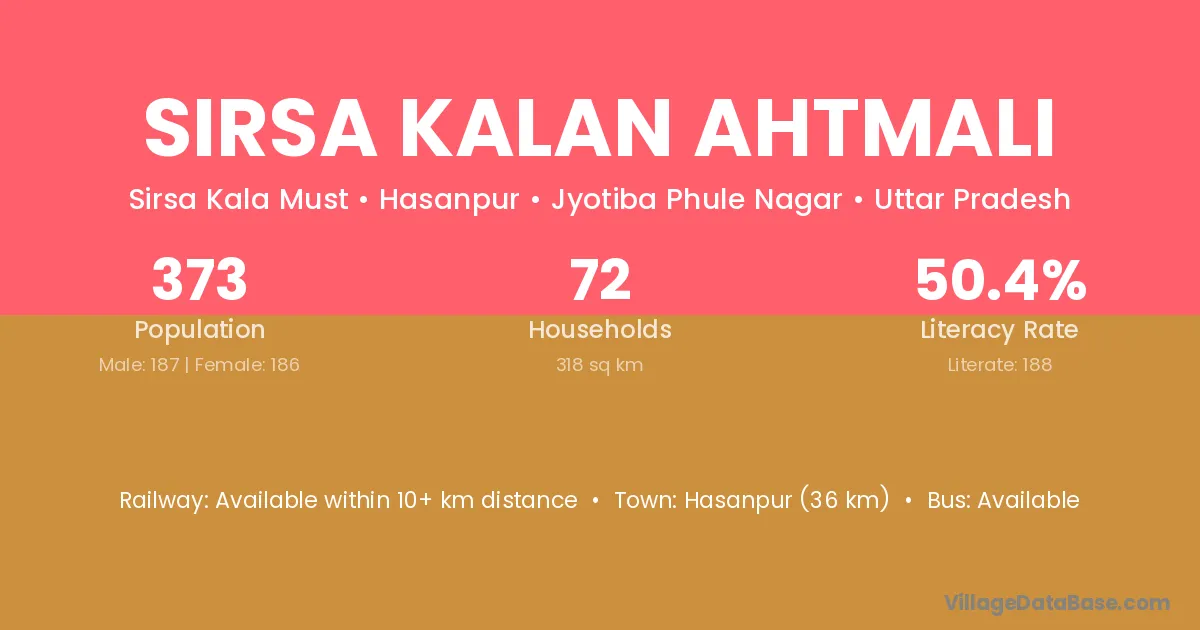 Sirsa Kalan Ahtmali village has a total population of 373 people, of which 187 are males and 186 are females.