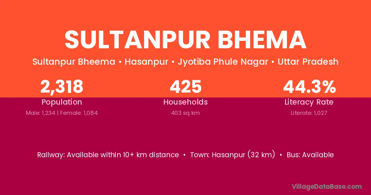 Hasanpur (32 km) is the nearest town to Sultanpur Bhema village for major economic activities and is located approximately 32 km away.