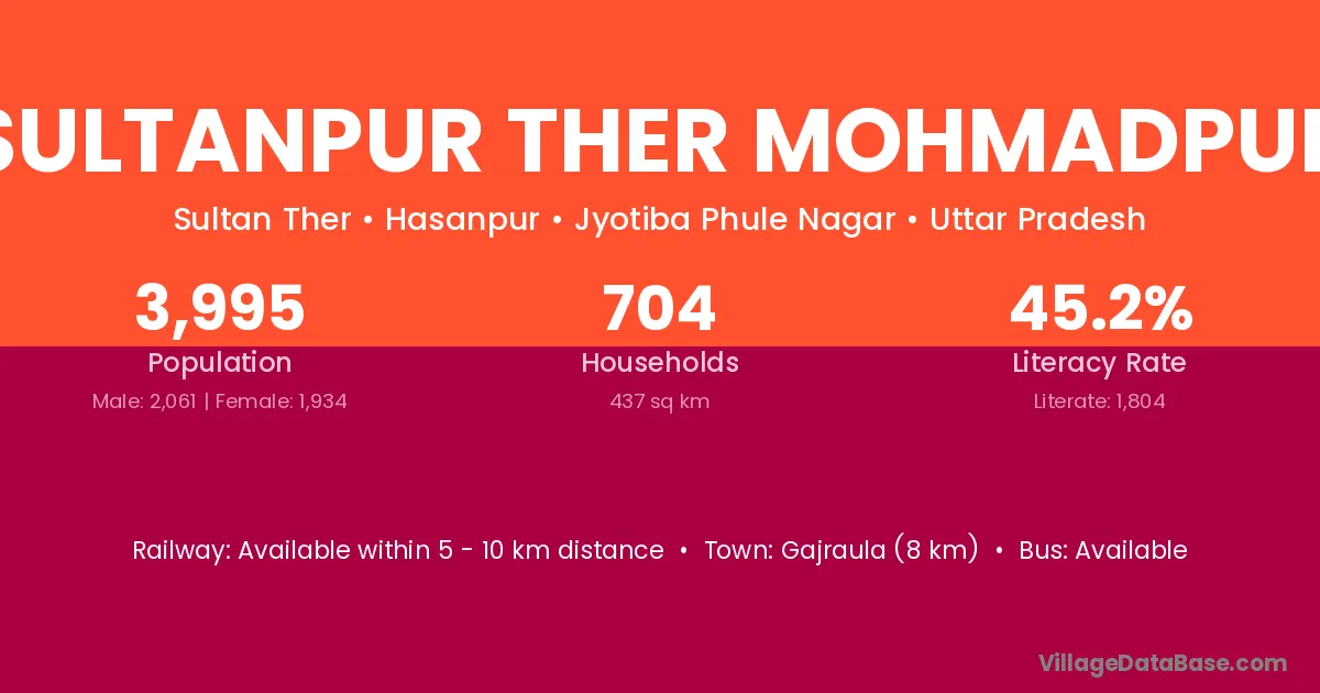 Gajraula (8 km) is the nearest town to Sultanpur Ther Mohmadpur village for major economic activities and is located approximately 8 km away.
