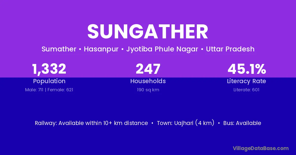Sungather village has a total population of 1,332 people, of which 711 are males and 621 are females.