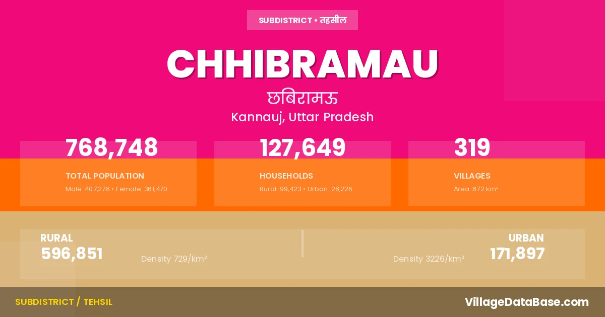 According to the 2011 census The total area of Chhibramau Tehsil is 872 km², with a population of 768748 people. The population density is 881 inhabitants per square kilometre, and there are approximately 127649 houses in the sub district.