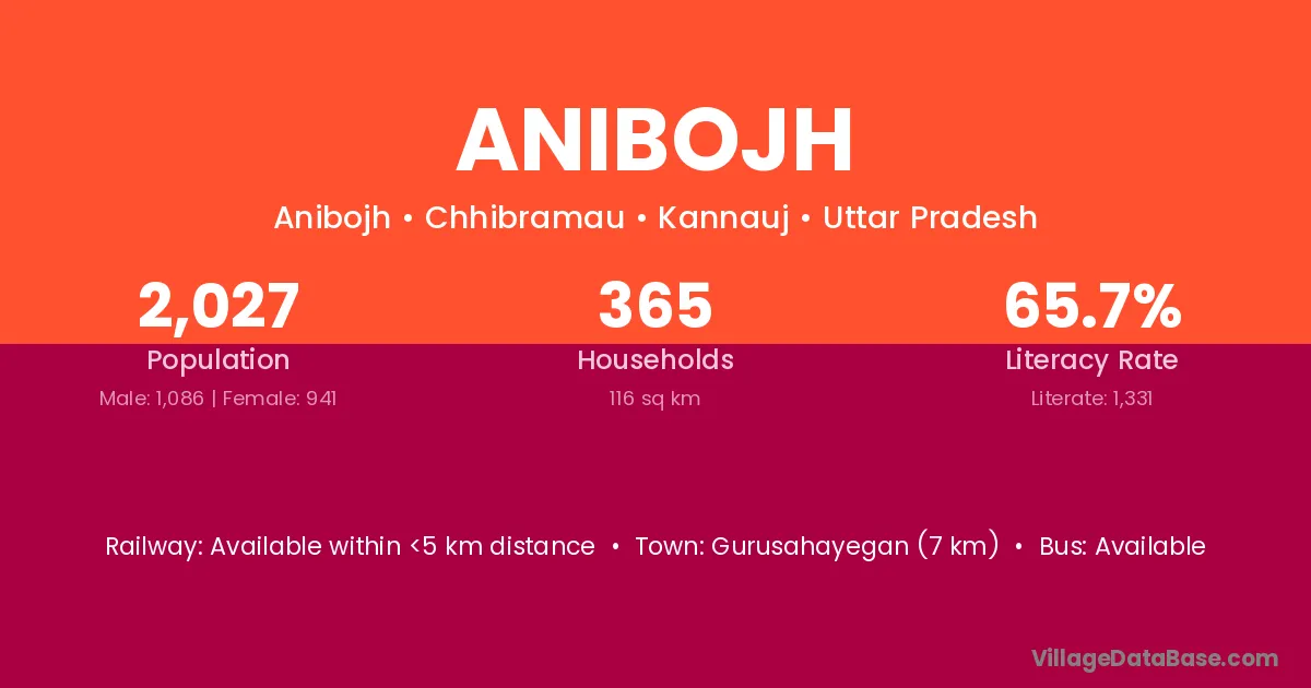Anibojh village has a total population of 2,027 people, of which 1,086 are males and 941 are females.