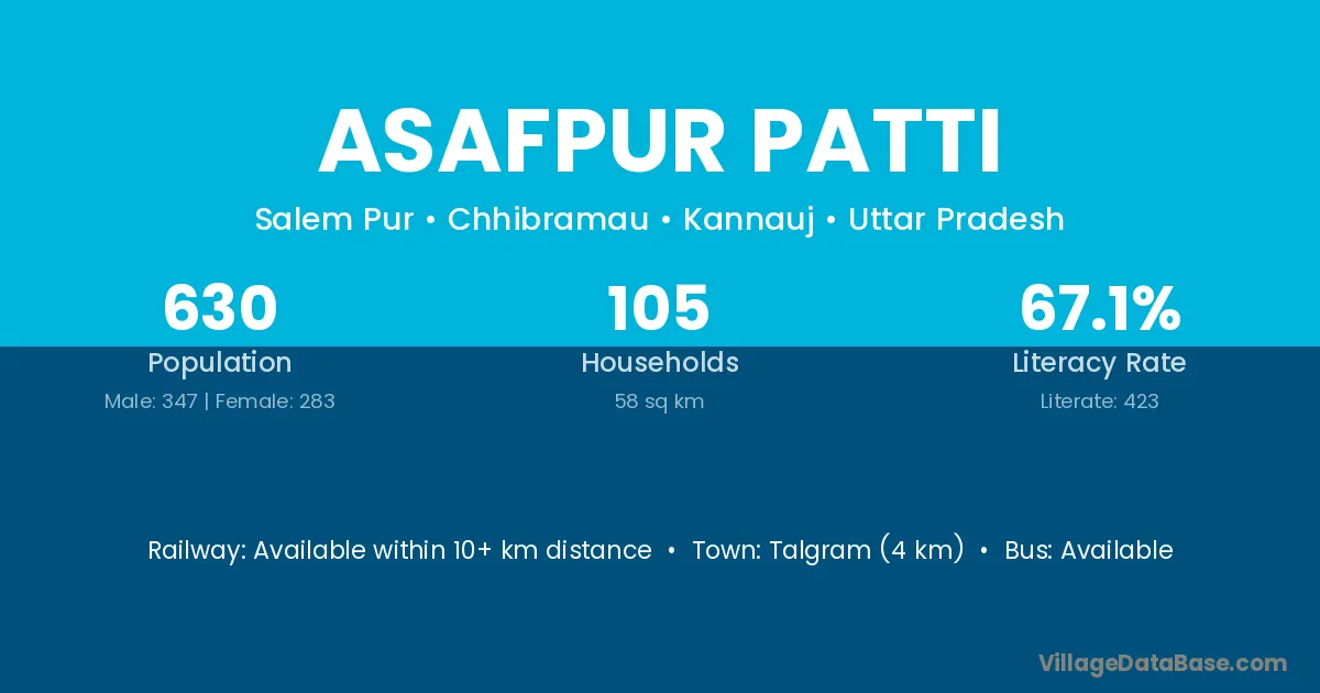 Talgram (4 km) is the nearest town to Asafpur Patti village for major economic activities and is located approximately 4 km away.