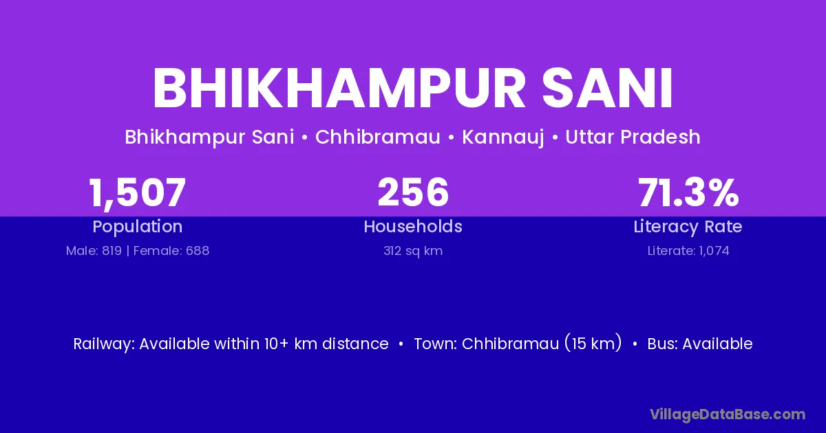 Chhibramau (15 km) is the nearest town to Bhikhampur Sani village for major economic activities and is located approximately 15 km away.