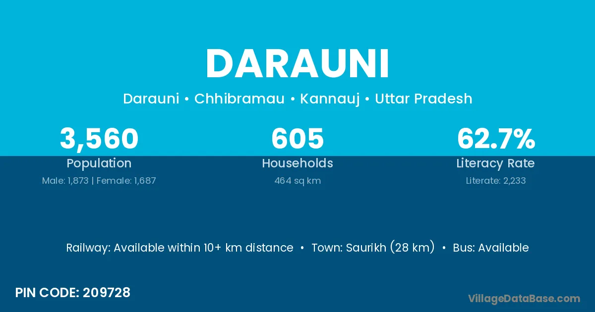Saurikh (28 km) is the nearest town to Darauni village for major economic activities and is located approximately 28 km away.