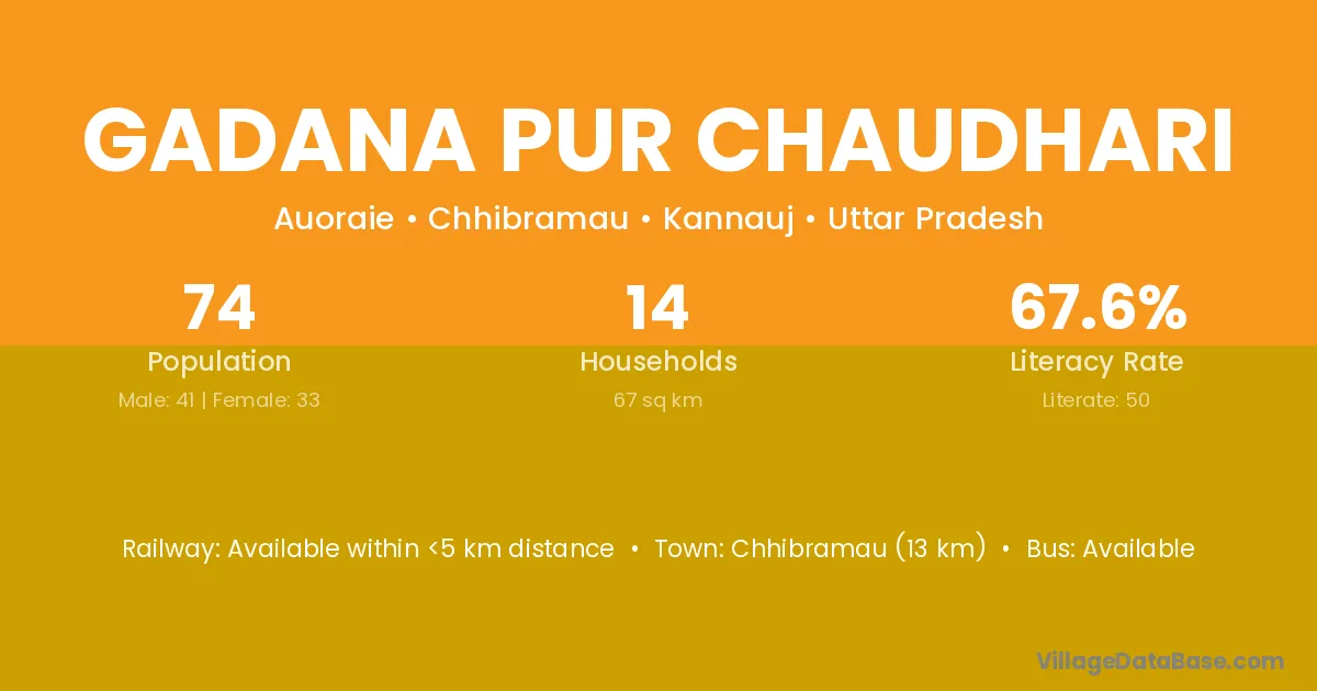 Chhibramau (13 km) is the nearest town to Gadana Pur Chaudhari village for major economic activities and is located approximately 13 km away.