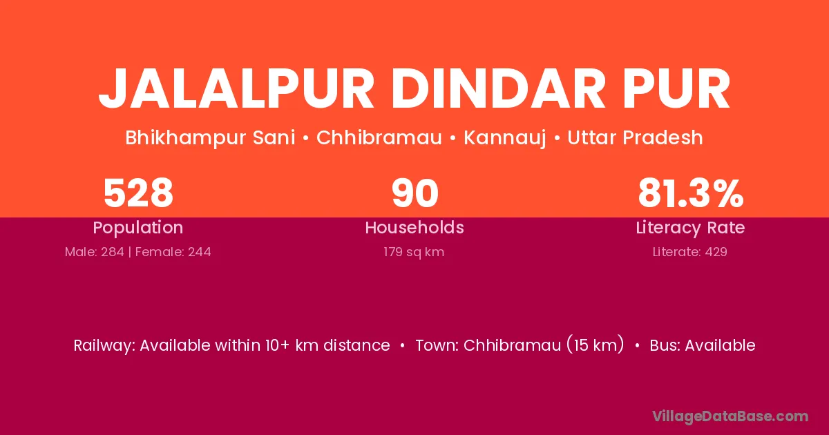 Chhibramau (15 km) is the nearest town to Jalalpur Dindar Pur village for major economic activities and is located approximately 15 km away.