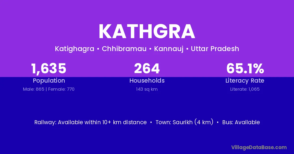 Kathgra village has a total population of 1,635 people, of which 865 are males and 770 are females.