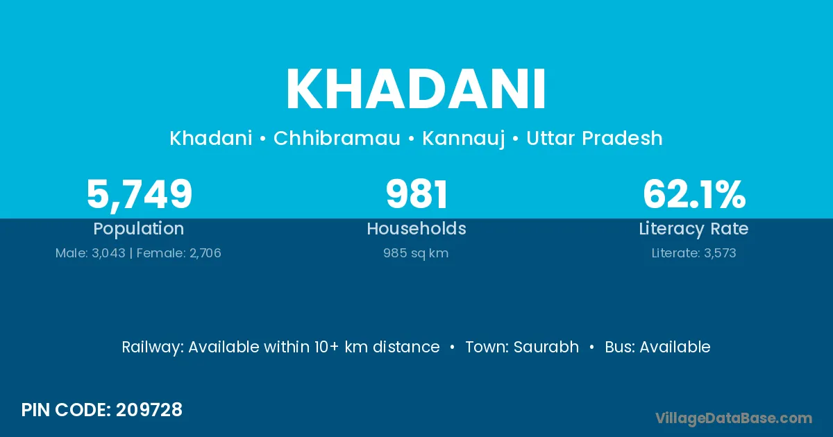 Khadani village has a total population of 5,749 people, of which 3,043 are males and 2,706 are females.