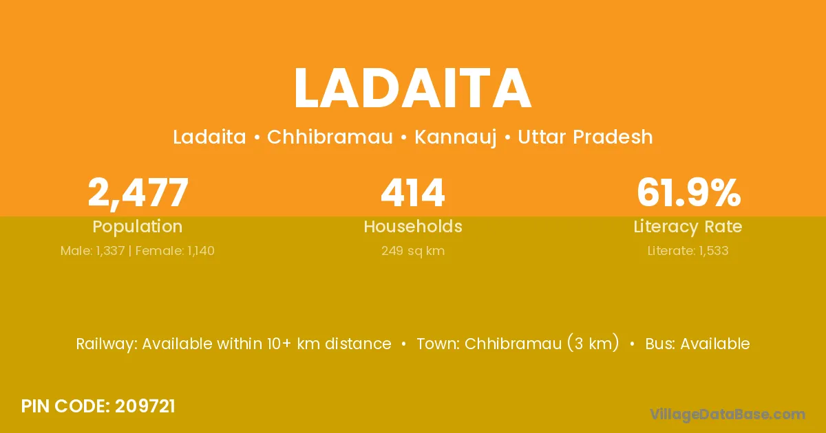 Chhibramau (3 km) is the nearest town to Ladaita village for major economic activities and is located approximately 3 km away.