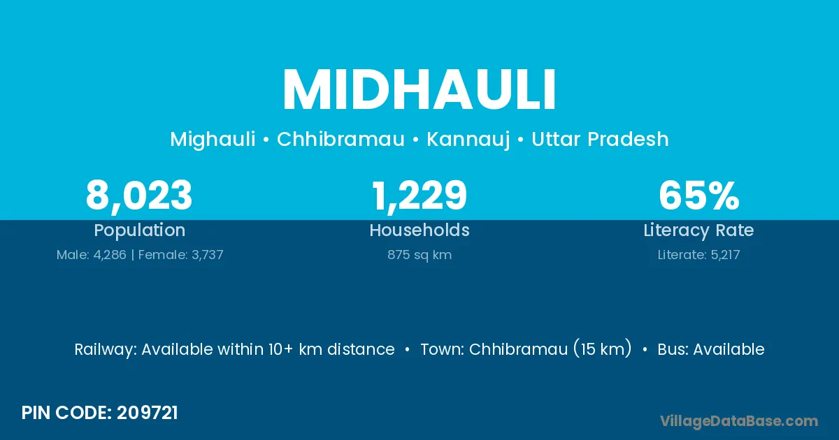 Chhibramau (15 km) is the nearest town to Midhauli village for major economic activities and is located approximately 15 km away.