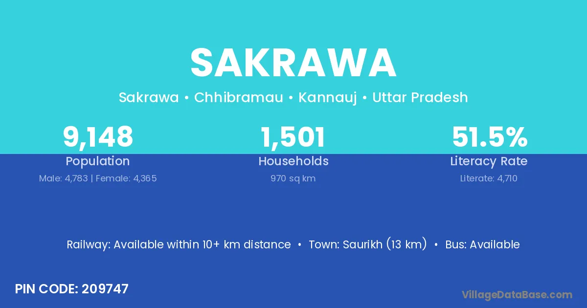 Sakrawa village has a total population of 9,148 people, of which 4,783 are males and 4,365 are females.