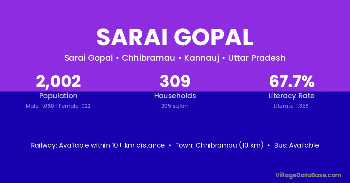 Chhibramau (10 km) is the nearest town to Sarai Gopal village for major economic activities and is located approximately 10 km away.