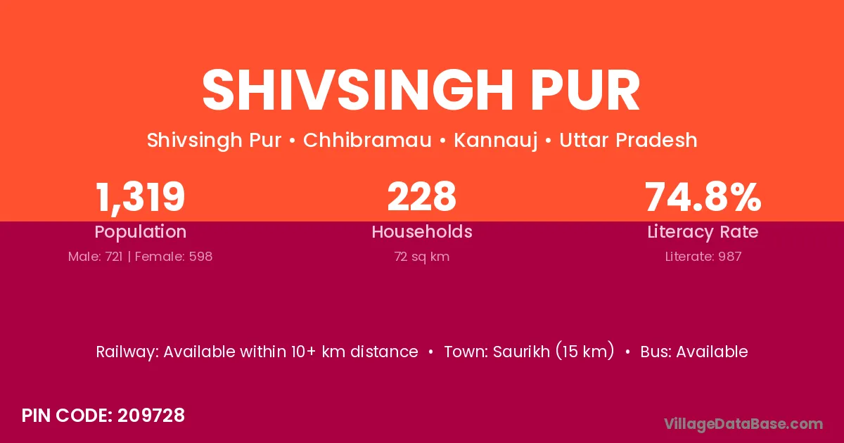 Shivsingh Pur village has a total population of 1,319 people, of which 721 are males and 598 are females.