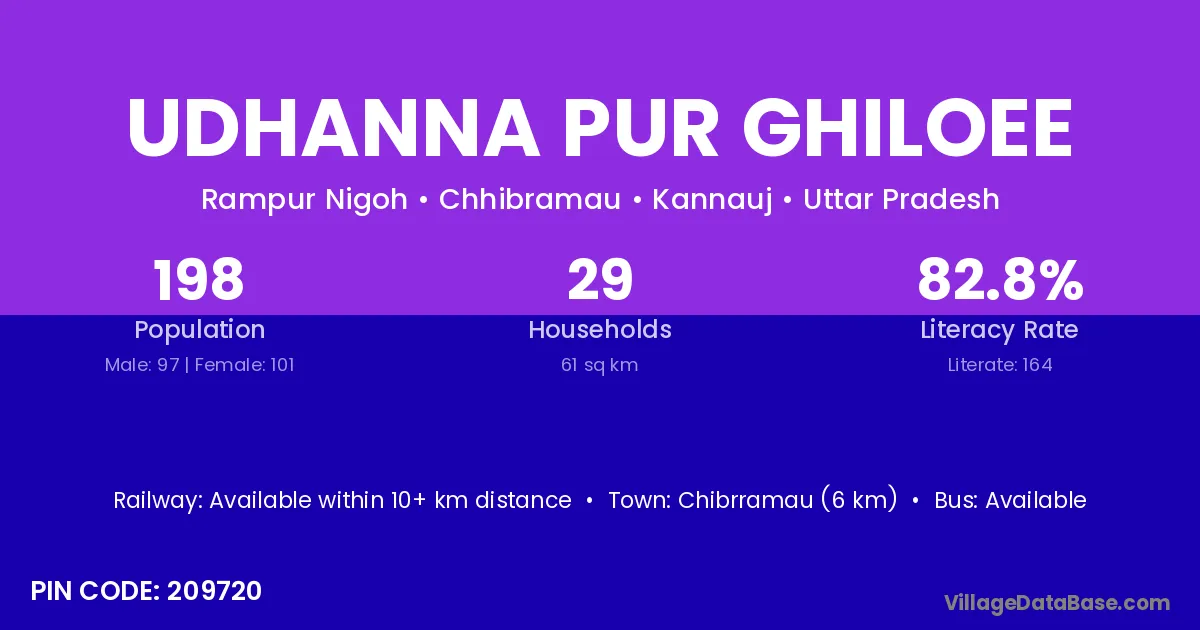 Udhanna Pur Ghiloee village has a total population of 198 people, of which 97 are males and 101 are females.