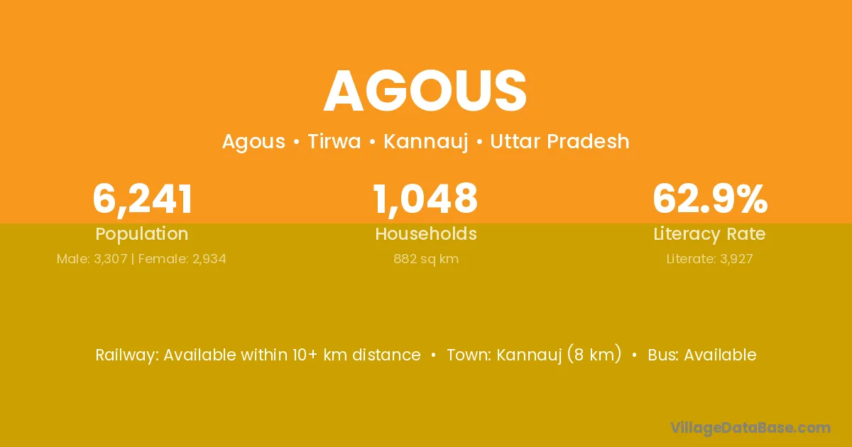 Kannauj (8 km) is the nearest town to Agous village for major economic activities and is located approximately 8 km away.