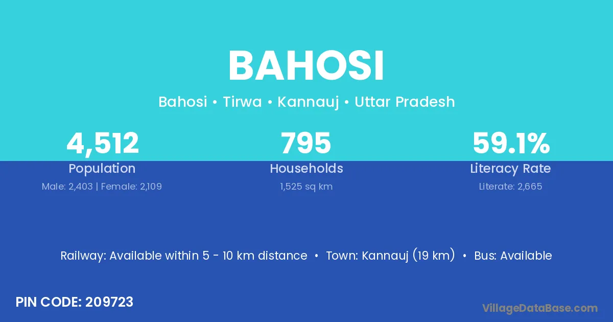 Kannauj (19 km) is the nearest town to Bahosi village for major economic activities and is located approximately 19 km away.