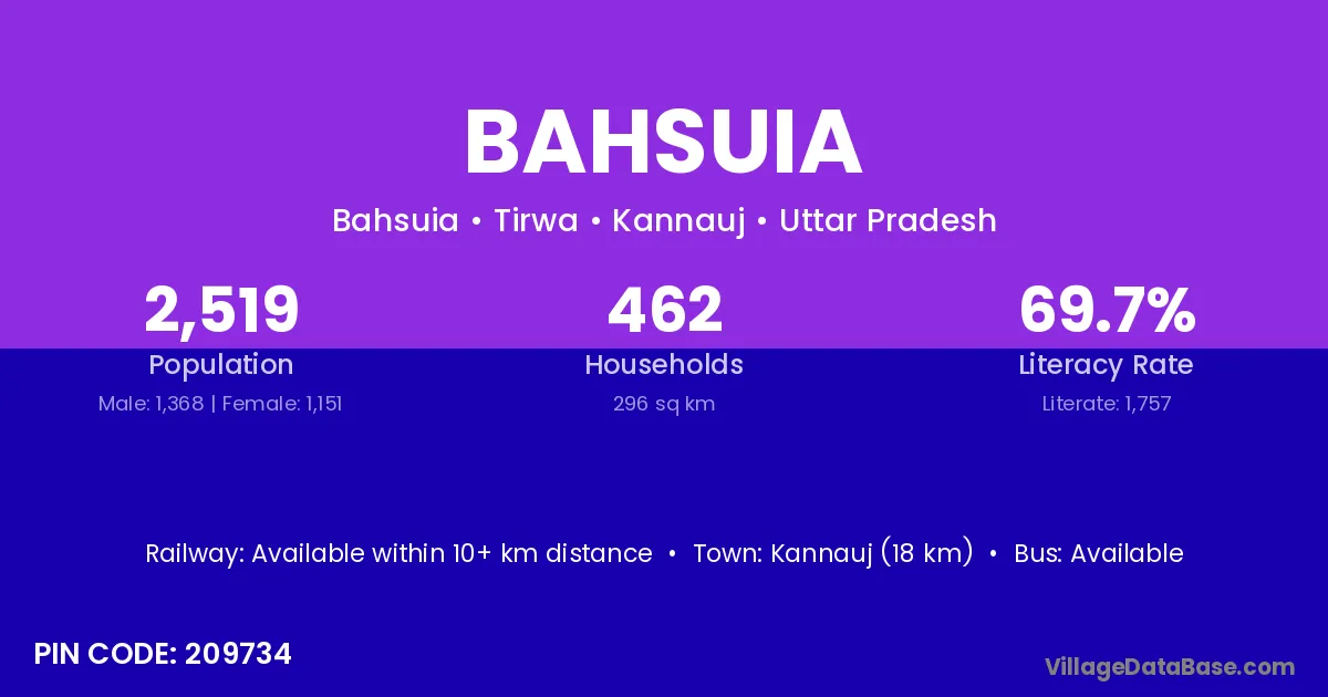 Kannauj (18 km) is the nearest town to Bahsuia village for major economic activities and is located approximately 18 km away.
