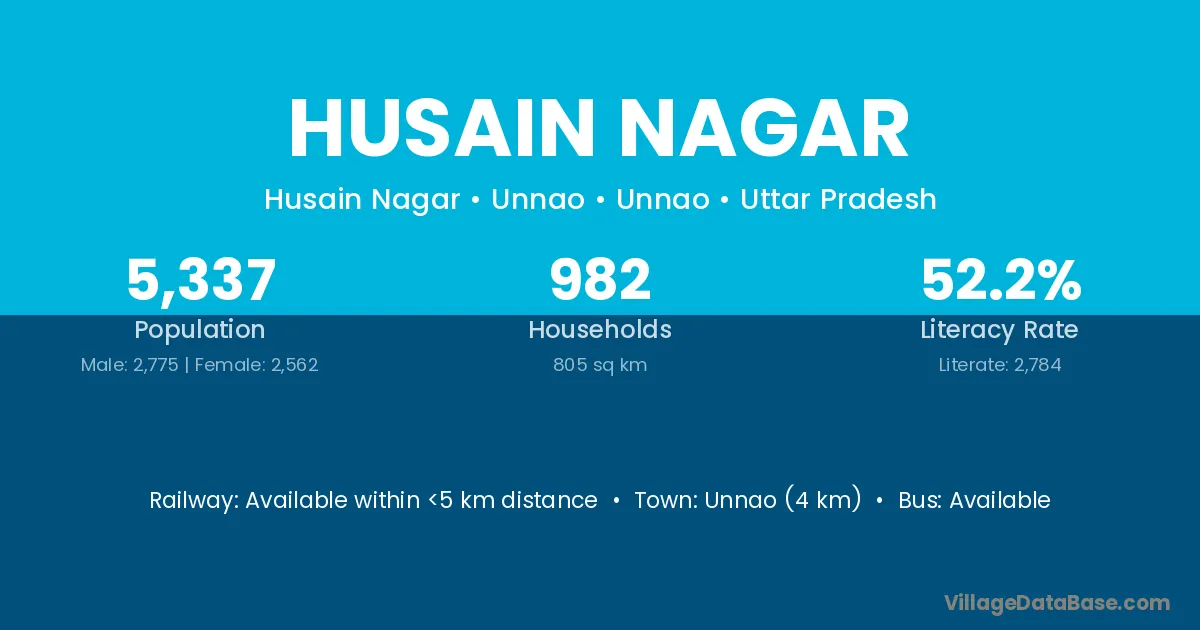 Kannauj (38 km) is the nearest town to Husain Nagar village for major economic activities and is located approximately 38 km away.