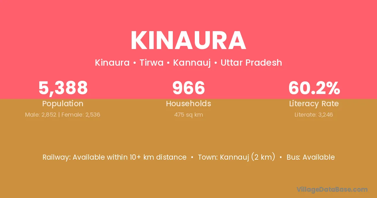 Kannauj (2 km) is the nearest town to Kinaura village for major economic activities and is located approximately 2 km away.