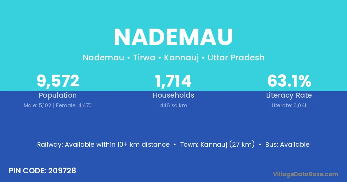 Kannauj (27 km) is the nearest town to Nademau village for major economic activities and is located approximately 27 km away.