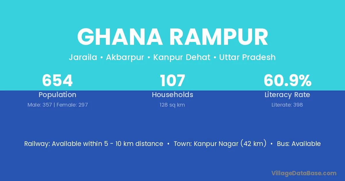 Kanpur Nagar (42 km) is the nearest town to Ghana Rampur village for major economic activities and is located approximately 42 km away.