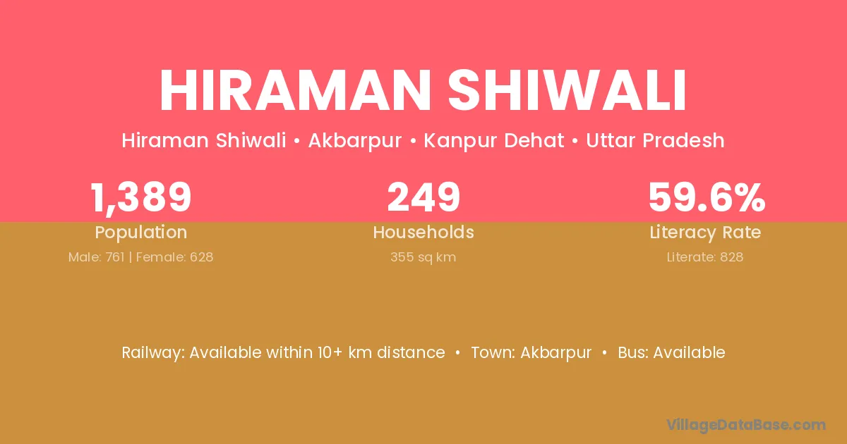 Hiraman Shiwali village has a total population of 1,389 people, of which 761 are males and 628 are females.