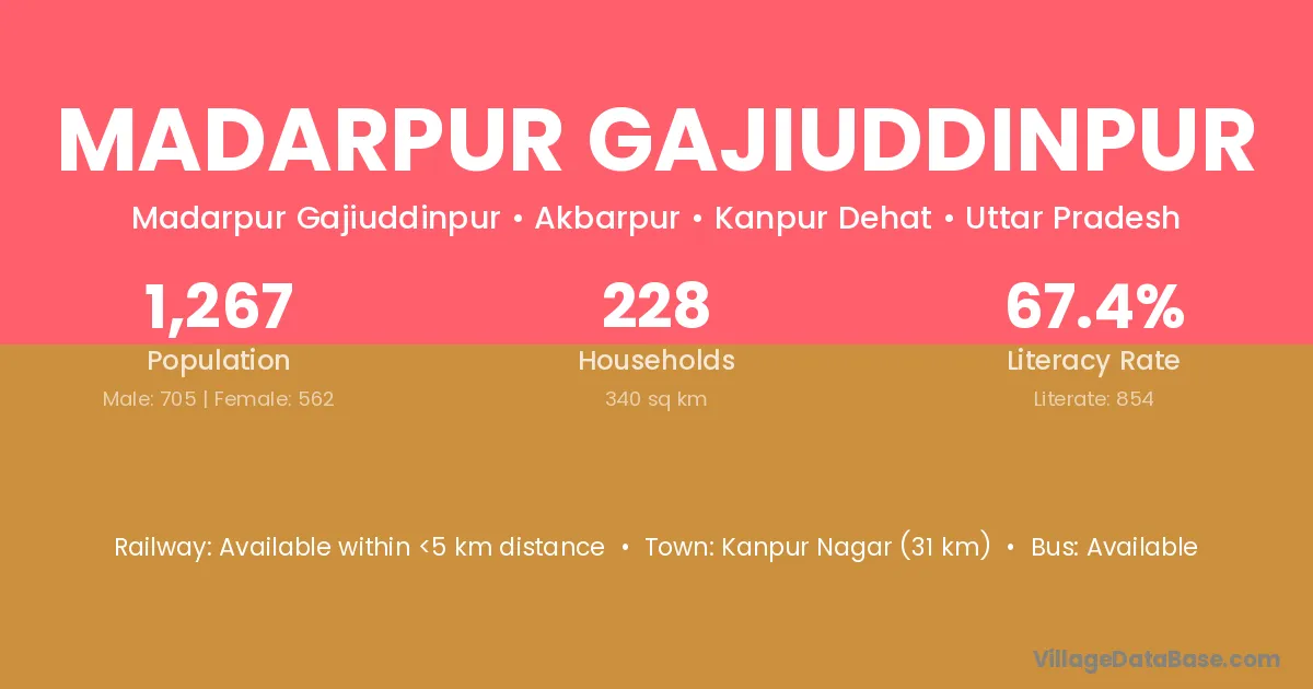 Kanpur Nagar (31 km) is the nearest town to Madarpur Gajiuddinpur village for major economic activities and is located approximately 31 km away.