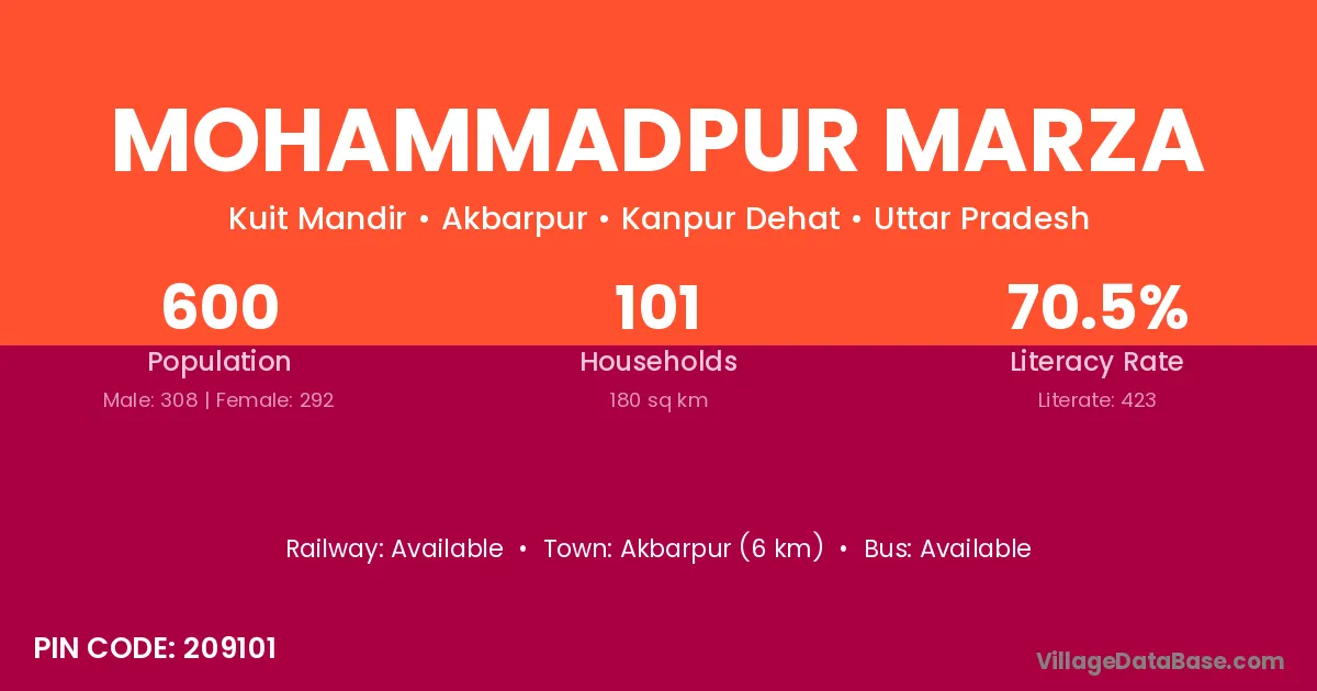 Mohammadpur Marza village has a total population of 600 people, of which 308 are males and 292 are females.