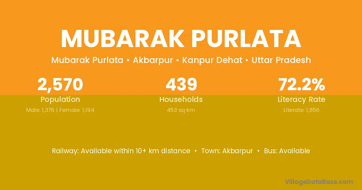 Mubarak Purlata village has a total population of 2,570 people, of which 1,376 are males and 1,194 are females.