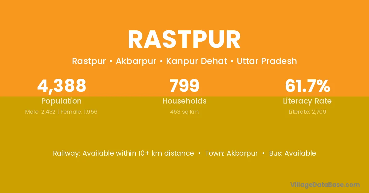 Rastpur village has a total population of 4,388 people, of which 2,432 are males and 1,956 are females.