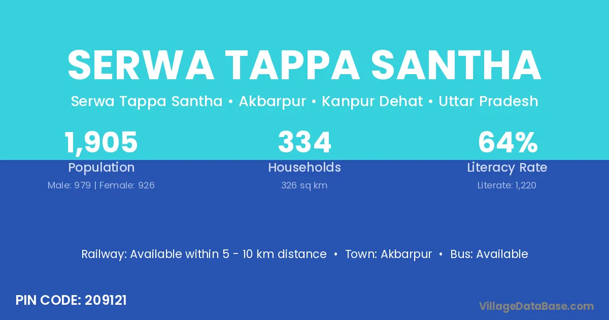 Serwa Tappa Santha village has a total population of 1,905 people, of which 979 are males and 926 are females.