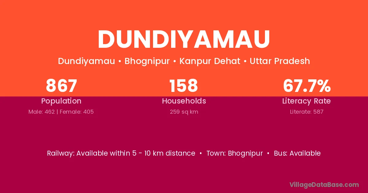 Dundiyamau village has a total population of 867 people, of which 462 are males and 405 are females.