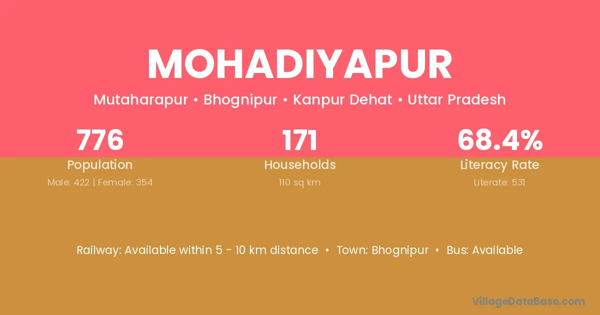 Mohadiyapur village has a total population of 776 people, of which 422 are males and 354 are females.