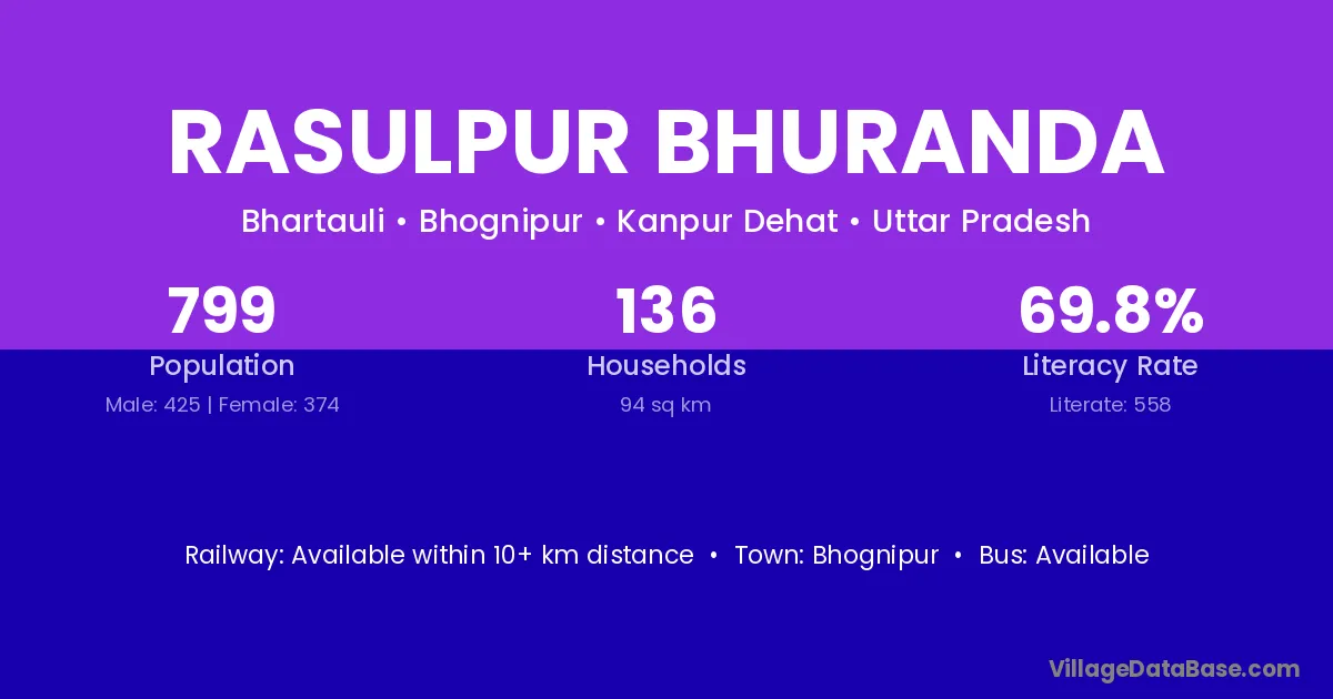 Rasulpur Bhuranda village has a total population of 799 people, of which 425 are males and 374 are females.