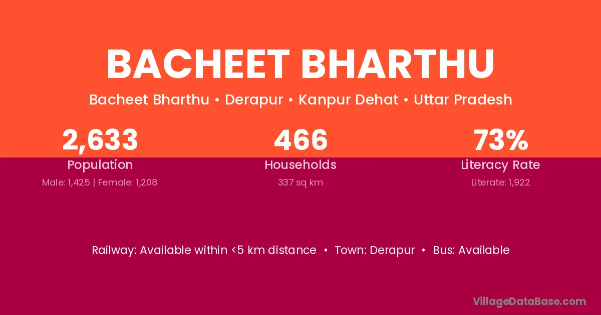 Bacheet Bharthu village has a total population of 2,633 people, of which 1,425 are males and 1,208 are females.