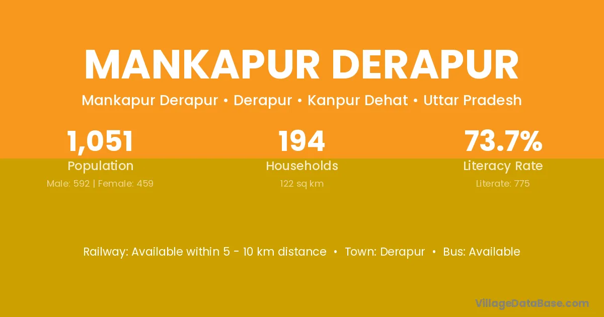 Mankapur Derapur village has a total population of 1,051 people, of which 592 are males and 459 are females.
