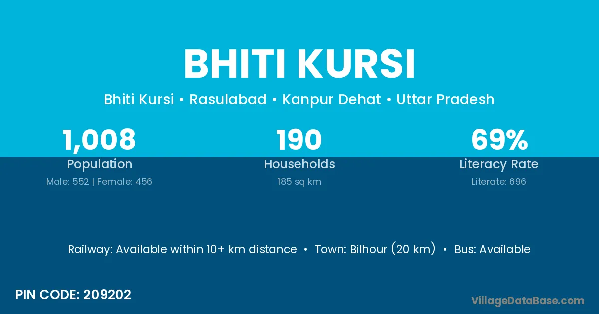 Bilhour (20 km) is the nearest town to Bhiti Kursi village for major economic activities and is located approximately 20 km away.